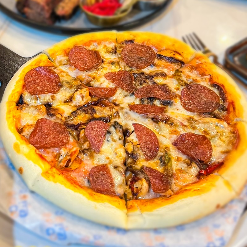 بيتزا ميت لافرز مزيج من لحم البريسكت المدخن واللحم المفروم والبيبروني والجبن الموتزاريلا