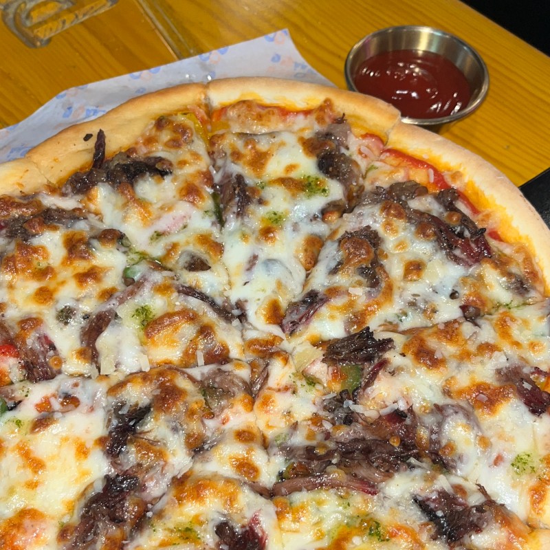 (546 سعرة حرارية)بيتزا بتشكيلة من لحم البرسكيت ولحم الاضلاع مع جبن الموزريلا