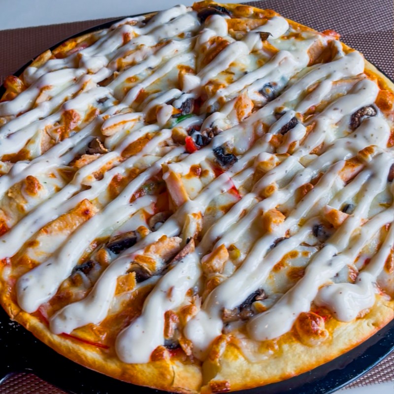 (556 سعرة حرارية)بيتزا مغطاه بقطع الدجاج والخضروات الطازجة و يمكنك اختيار صوص الباربكيو اللذيذ او صوص الرانش